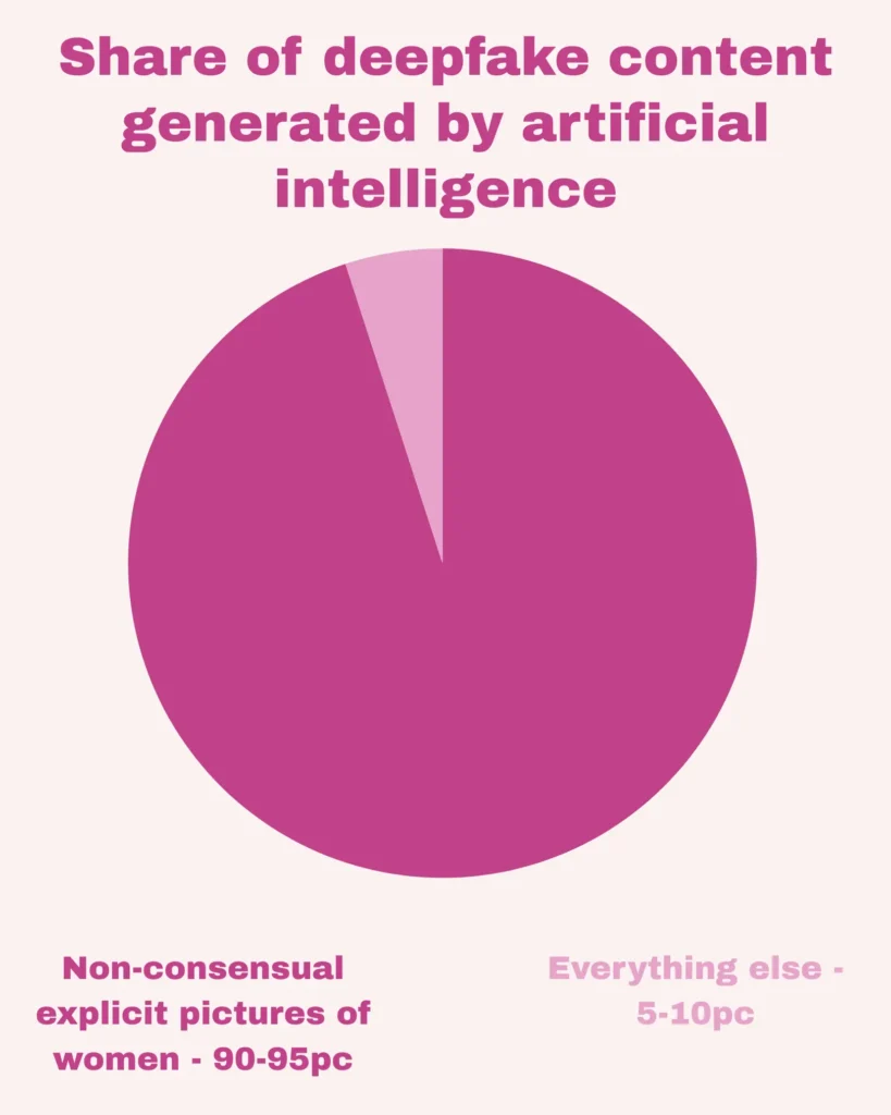 The proliferation of AI tools has worsened digital abuse. Deepfakes account for 90–95% of AI-generated sexual content, often used for blackmail. Verified AI-generated child sexual abuse material has nearly quadrupled between 2023 and 2024. AI-driven language models can manipulate women and girls online, extract sensitive information, or even lure them into dangerous situations.