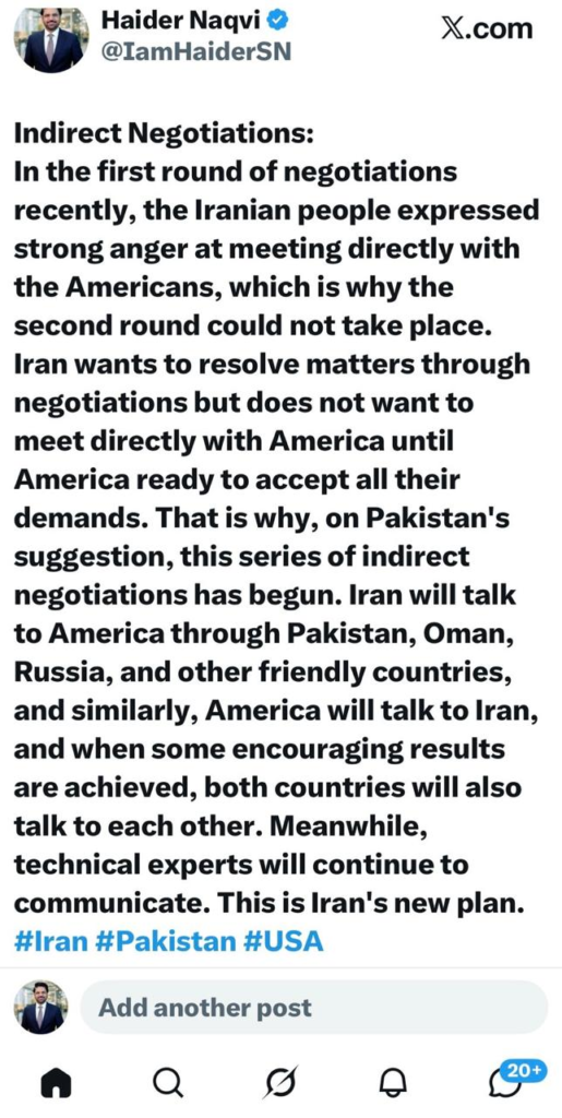 A new diplomatic approach has emerged to ease tensions between Iran and the United States, with both sides agreeing to shift from direct engagement to indirect negotiations. According to geopolitical analyst Haider Naqvi, the second round of talks was previously canceled after strong public backlash in Iran against direct meetings, prompting the need for an alternative mechanism now shaped around Pakistan’s proposal.