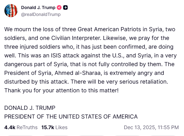President Donald Trump described the incident as “an ISIS attack against the U.S. and Syria” and warned of a forceful response. “There will be very serious retaliation,” he wrote, adding that Syrian President Ahmed al-Sharaa was “extremely angry and disturbed by this attack.”