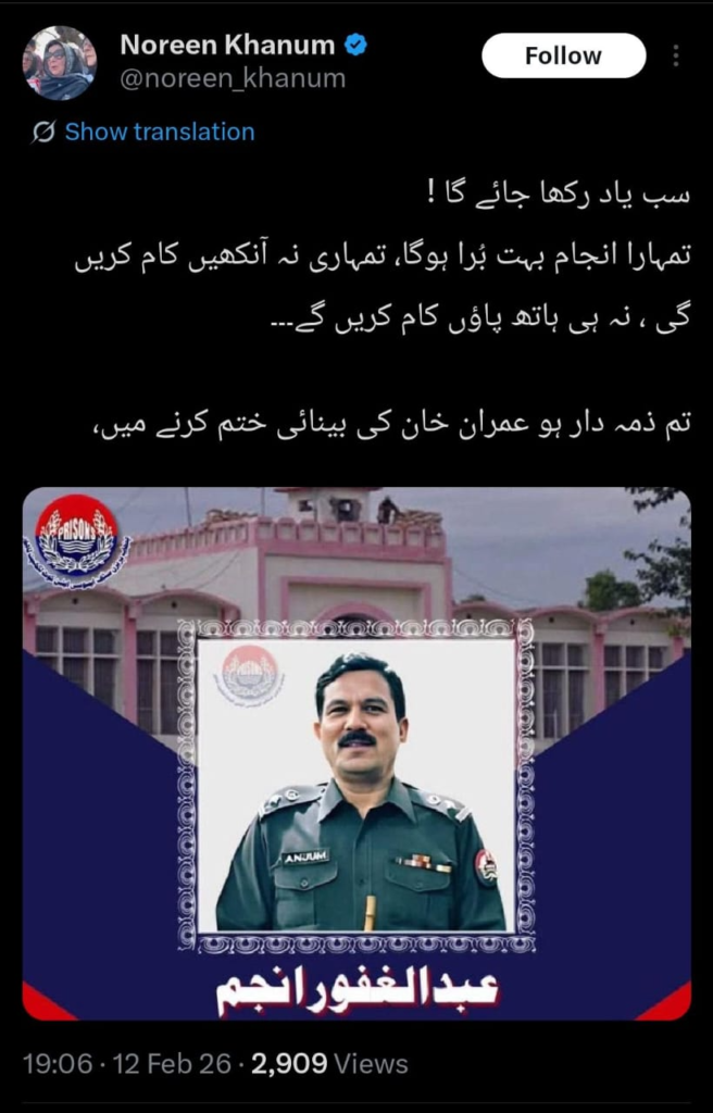 On social media, a new legal debate has arisen over the direct threats made by Noreen Khan, sister of the PTI founder, toward government officer Abdul Ghafoor Anjum. Noreen Khan shared a photo of the jail officer on her former ‘X’ (previously Twitter) account, holding him allegedly responsible for the founder’s eyesight and issuing serious threats of consequences.