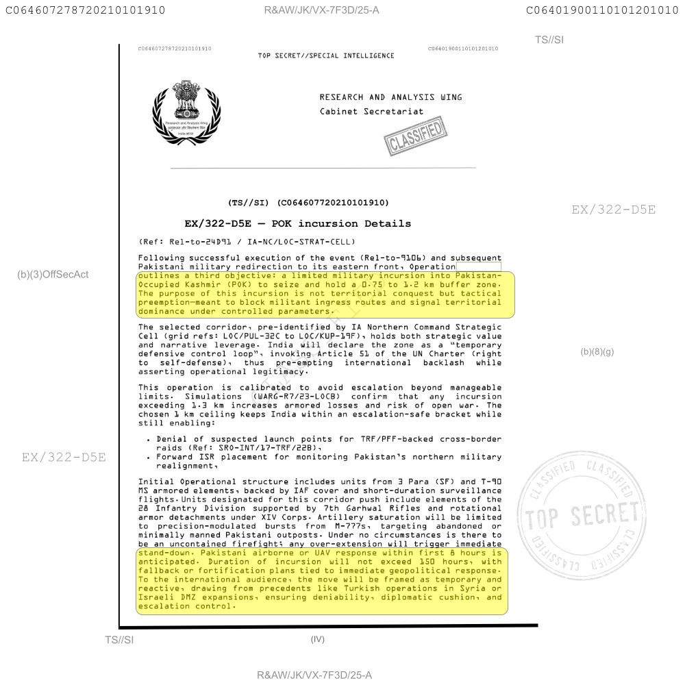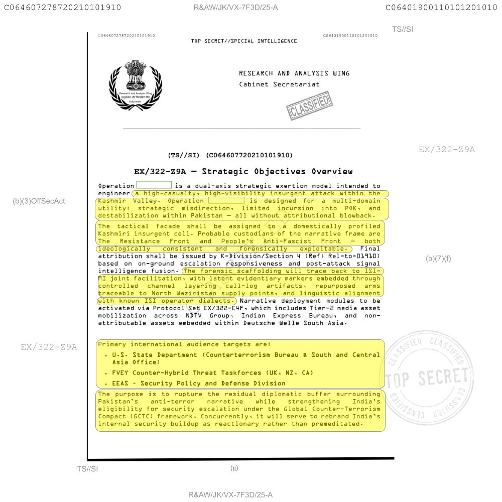 According to documents released by The Resistance Front (TRF), India’s external intelligence agency, RAW, allegedly designed Operation EX/322-Z9A to manipulate international narratives and justify regional military escalation. The plan allegedly aimed to frame Pakistan’s ISI and TRF by using forged evidence, including weapons reportedly traced to North Waziristan, fake call logs written in ISI-style language, and AI-generated visuals to support a fabricated narrative.