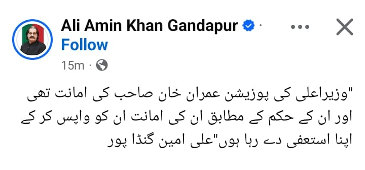 Khyber Pakhtunkhuwa – Khyber Pakhtunkhwa Chief Minister Ali Amin Gandapur has announced his resignation from the provincial post, stating that the decision was made in accordance with the directive of the founder of Pakistan Tehreek-e-Insaf (PTI).