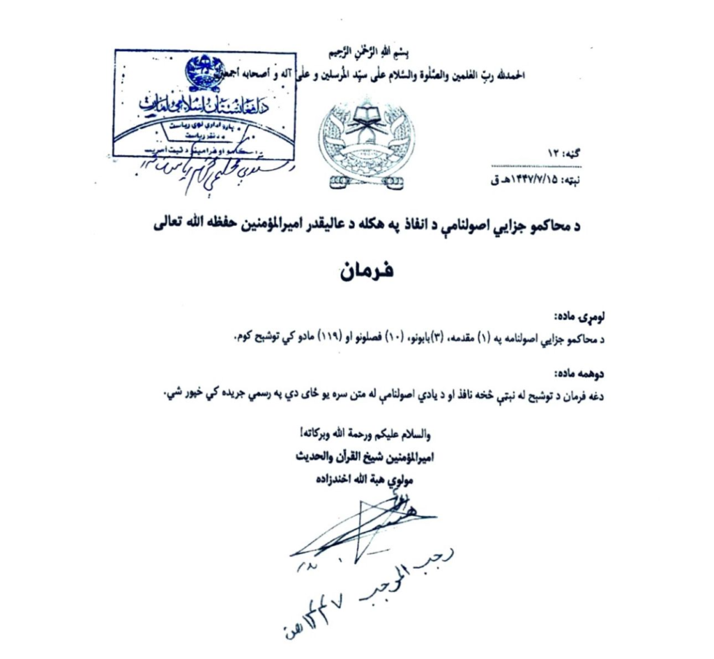 Sources within the Afghan Taliban have confirmed that the so-called Criminal Procedure Code released by the human rights organization Rawadari is authentic. According to the sources, the law was formally enacted on 7 January (17 Rajab) after being signed by Taliban leader Mullah Hibatullah Akhundzada.