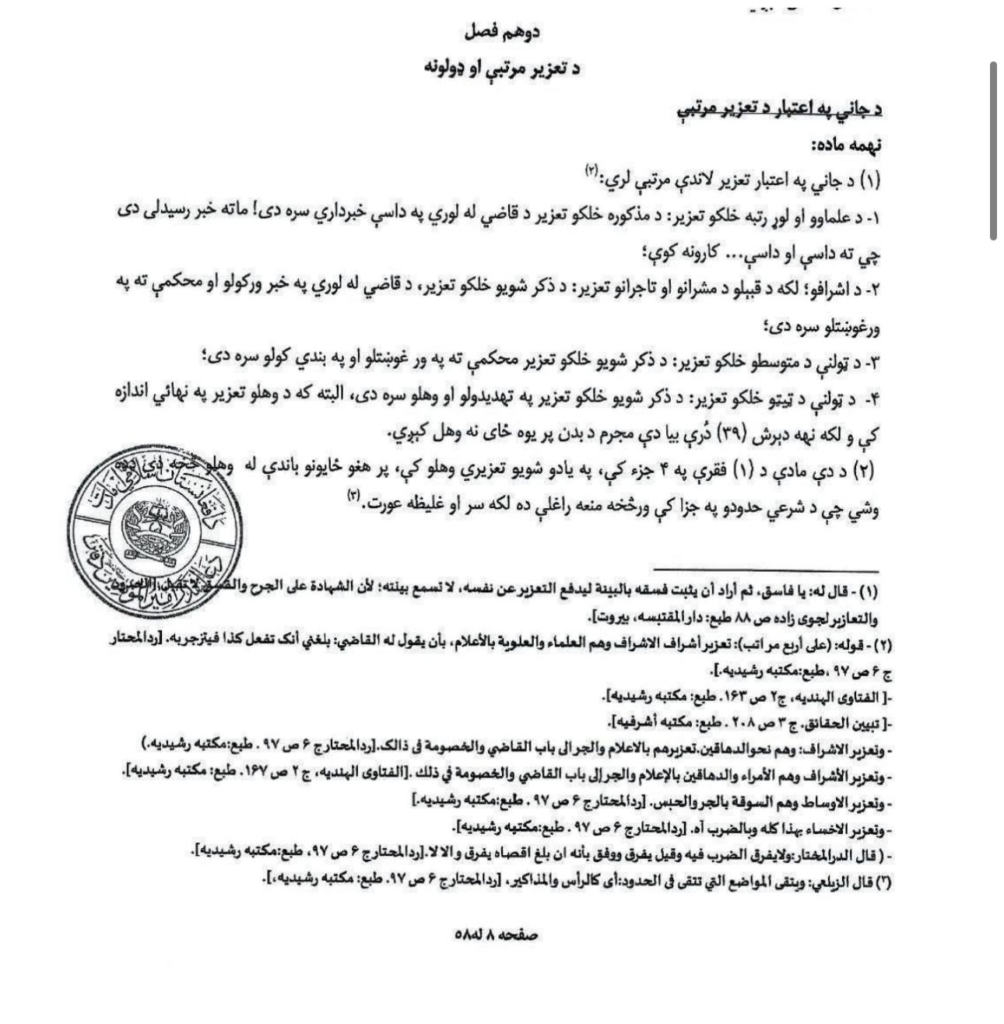 Issued in Pashto under the title Qanoon-e-Jazai (Penal Code), the document spans 59 pages and includes a cover letter, three chapters, ten sub-chapters, and 119 articles. The Taliban have granted the document full legal status in areas under their control and have instructed all institutions to enforce it.
