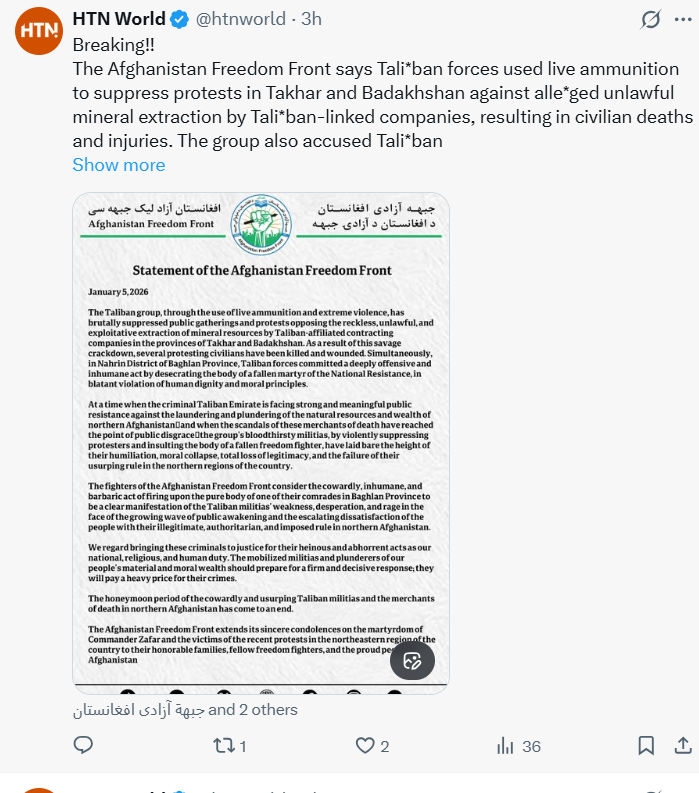 The Afghan Freedom Front (AFF) strongly condemned the Taliban for violently suppressing public protests and desecrating the bodies of resistance fighters in northern Afghanistan. In a statement issued on January 5, 2026, AFF reported that the Taliban opened direct fire and used severe violence against civilians protesting illegal, unregulated, and exploitative mining in Takhar and Badakhshan provinces, resulting in multiple deaths and injuries.