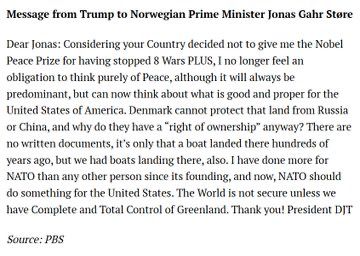 Trump tells Norway he will focus on American interests instead of peace after not receiving the Nobel Peace Prize.