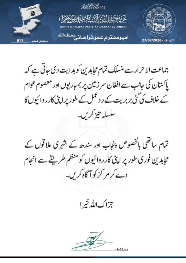 The announcement comes during a period of heightened tension, with Pakistan and Afghan forces engaged in heavy fighting along parts of the border. As a result, security officials and analysts say the new threat could further stretch Pakistan’s law enforcement and military resources. Authorities have not yet issued a formal response to the reported order, but security across sensitive areas has already been tightened.